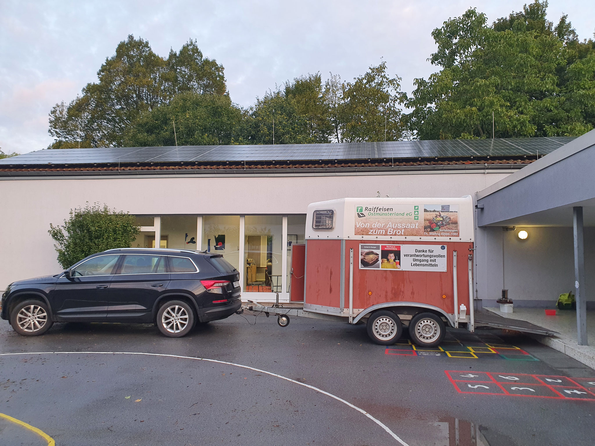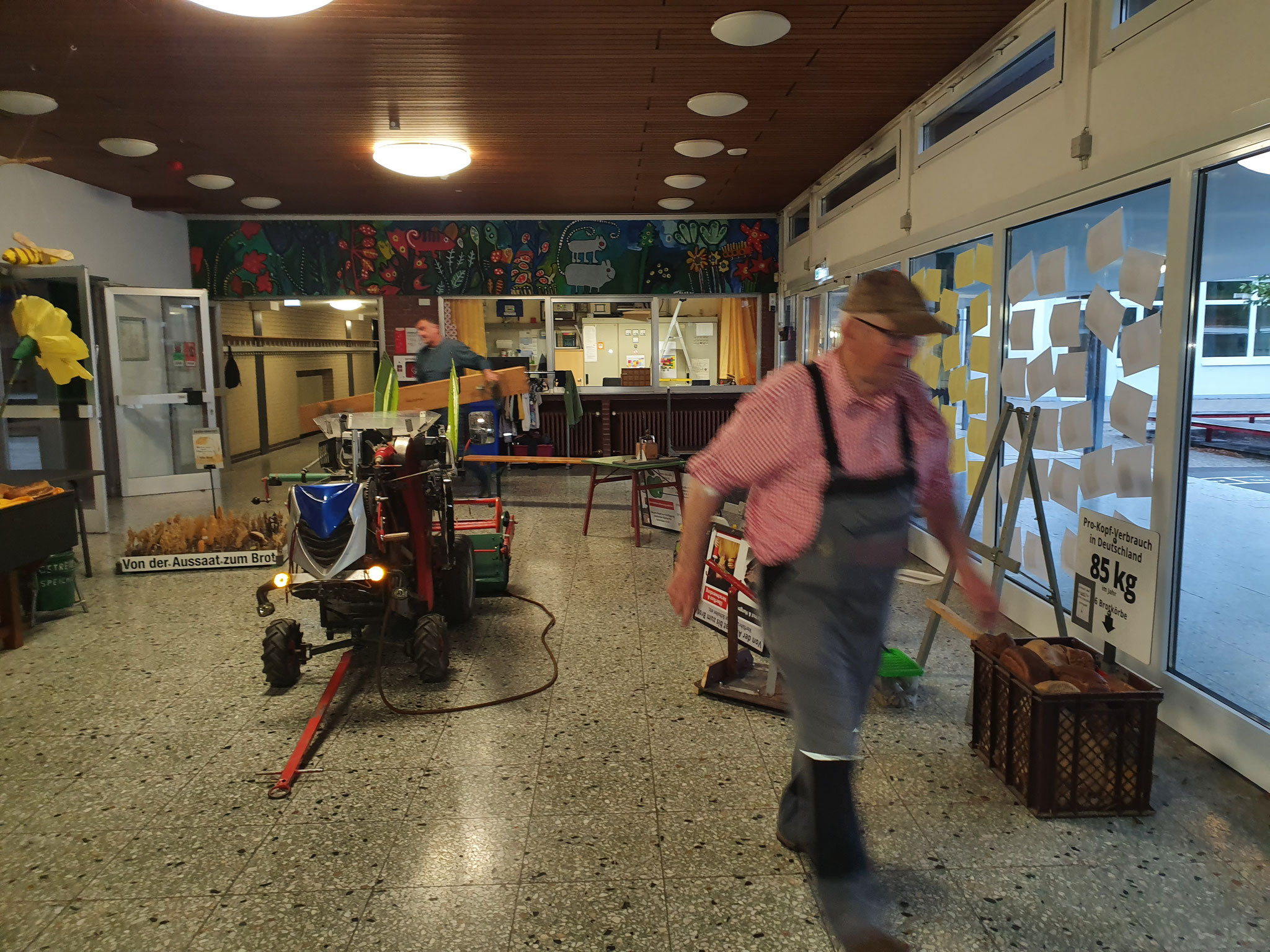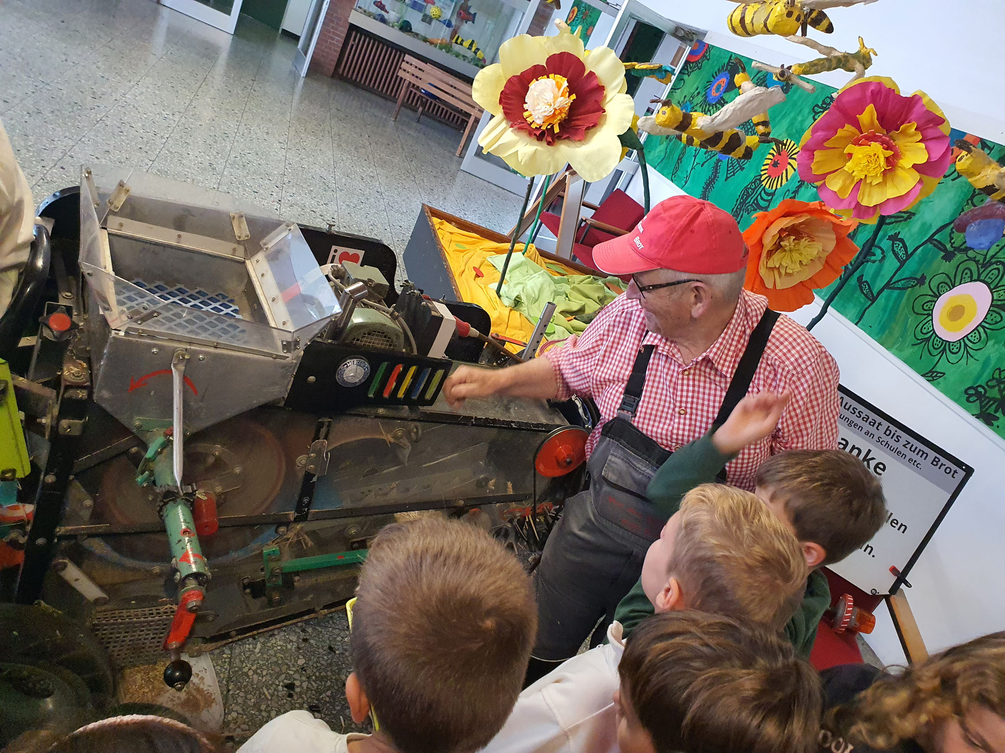 Am Donnerstag gab es im Eingangsbereich der Wilbrandschule einiges zu sehen. Zu Besuch war Herr Steiling aus Beelen mit seinem Kinder-Mähdrescher.