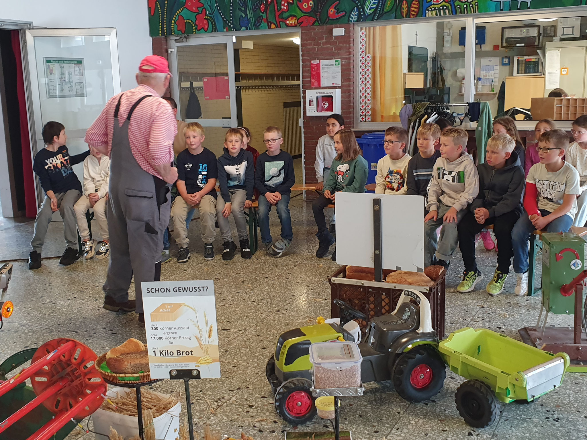 Die Kinder der drei dritten Klassen beschäftigen sich mit dem Thema Getreide und waren nun gespannt zu erfahren, was Herr Steiling alles mitgebracht hat.