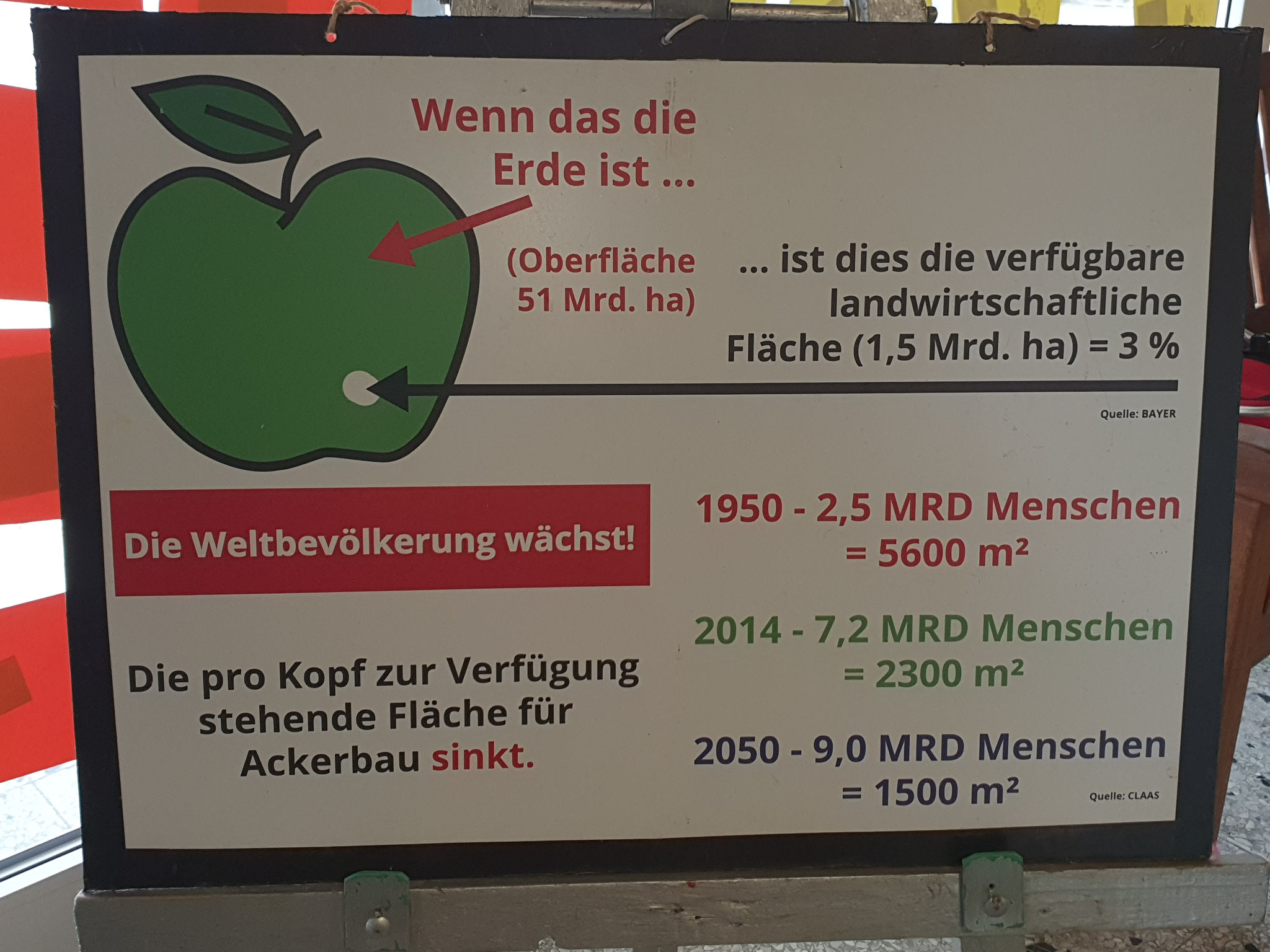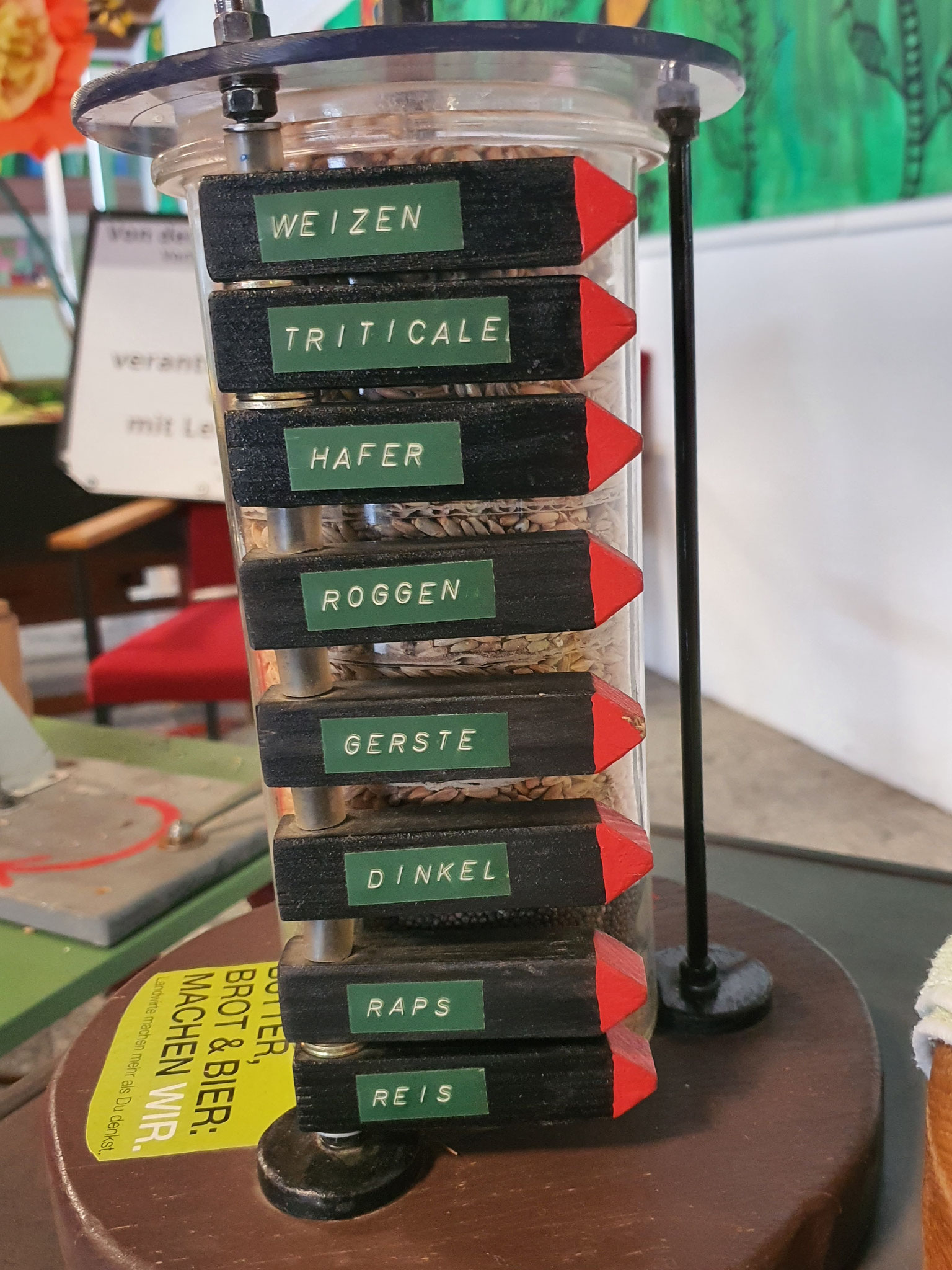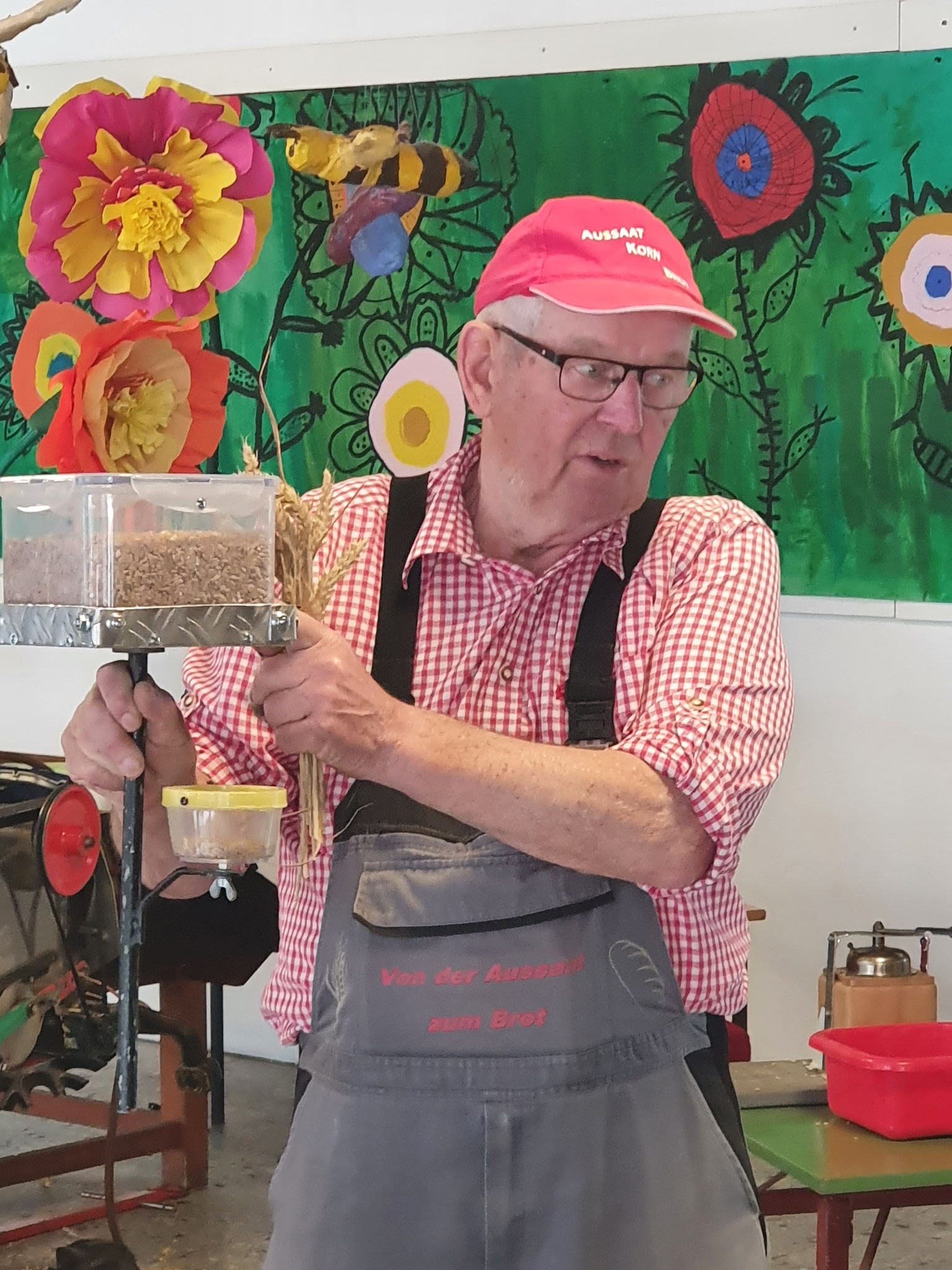 An der Seite wurden einige Halme eingegeben und man konnte durch eine Scheibe die Vorgänge im Inneren des Mähdreschers verfolgen. Die Körner wurden aufgefangen.
