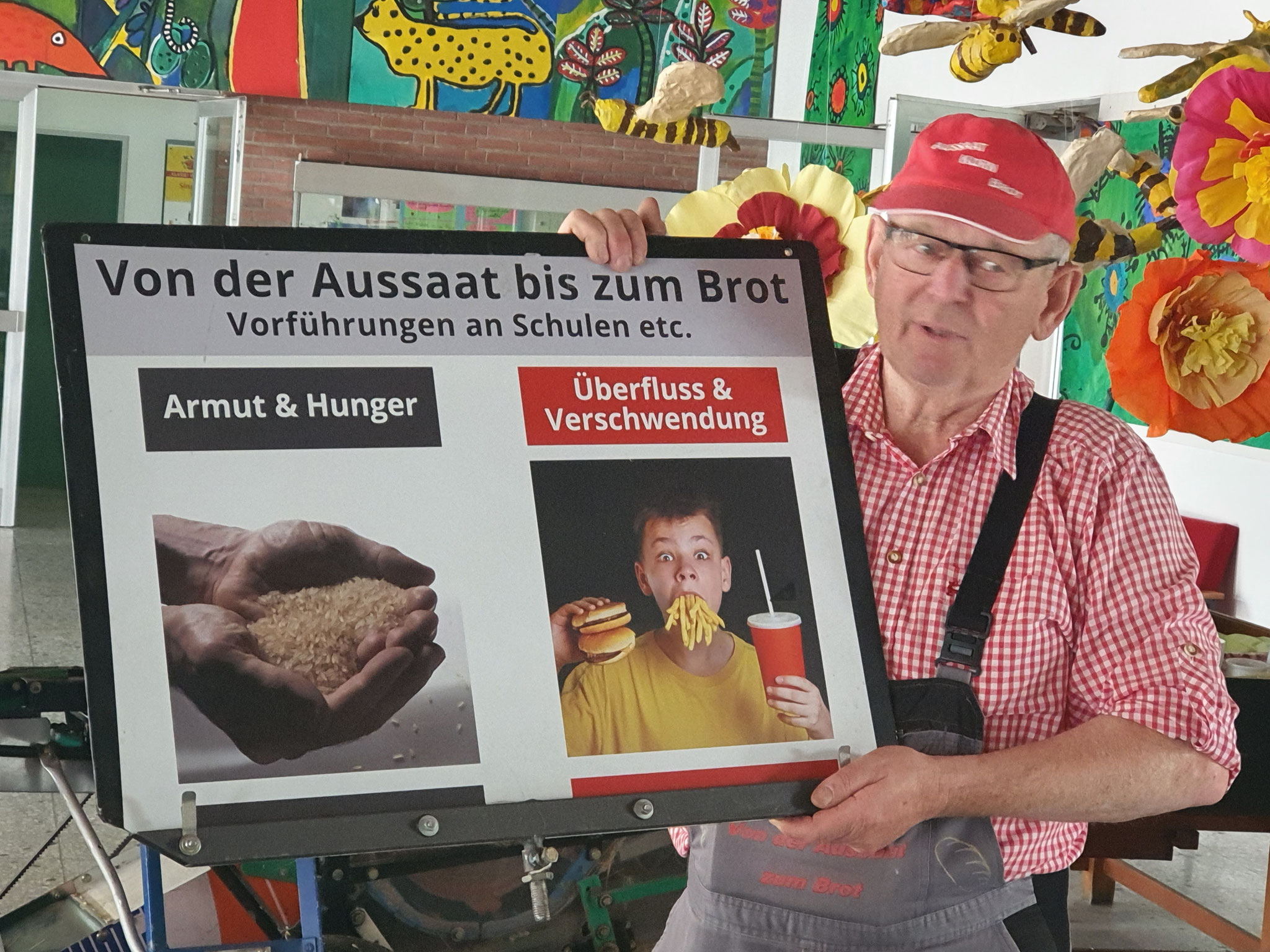Während seines sehr kindgemäßen und kurzweiligen Vortrags wies Herr Steiling immer wieder auf seine wichtigste Botschaft hin: Keine Lebensmittel zu verschwenden und diese wertzuschätzen. Diesen Rat nahmen die Kinder gerne an und wissen nun, dass es ein langer Weg mit vielen Arbeitsschritten ist, bis das Korn zum Brot werden kann.