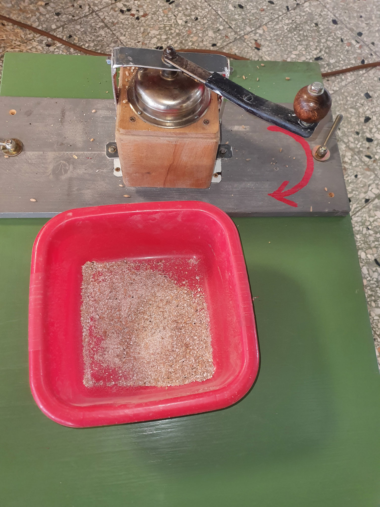 Um den Prozess „vom Korn zum Brot“ weiter zu verfolgen, durften dann zwei Kinder die gewonnenen Körner in einer alten Kaffeemühle unter lauten “Schneller-schneller!“ - Rufen zu Mehl mahlen.